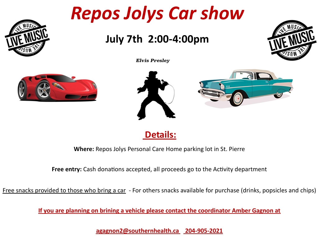 The Repos Jolys is a 22-bed personal care home attached to the hospital. Nursing care; activities coordinator; spiritual care and more. It`s the pride of our communities! Car show poster info